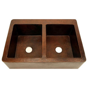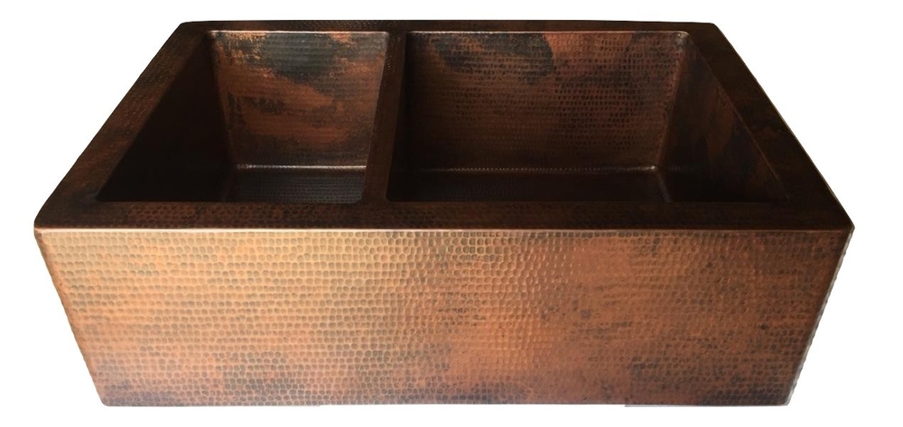 1. SINKOLOGY. David Undermount 18.25-in x 31.25-in Antique Copper Single Bowl Corner Install Kitchen Sink. Model # SK203-31AC. Find My Store. for pricing and availability. SINKOLOGY. Farmhouse Apron Front 33-in x 22-in Antique Copper Single Bowl Kitchen Sink All-in-One Kit. Model # K1A-1004-F529-D. SINKOLOGY Renzen Farmhouse Apron-Front Handmade Copper 36 in. 50/50 Double Bowl Kitchen Sink in Antique Copper with Scroll Design Model# SK312-36SC (4) $99134 Add To Cart Compare SINKOLOGY Rockwell All-in-One Copper Sink 33 in. Double Bowl 50/50 Farmhouse Apron Kitchen Sink with Faucet and Drains Model# K2A-1005-COUBD $102703 Add To Cart Compare Product Details Outer Sink Dimensions (Length x Width x Height): 36" x 22" x 9" Constructed from 16 gauge copper lending to a magnificent look; patina applied using French hot process so color is ingrained The single basin design maximizes the amount of usable space in the sink basin Farmhouse Sinks 36" Raina Copper Farmhouse Sink The Raina Farmhouse Sink has a smooth apron that makes the hammered texture inside a delightfully contrasting accent. This solid copper sink upgrades your kitchen with a warm, antique look and it provides plentiful space for filling or washing even the most cumbersome of cookware. Signature Hardware