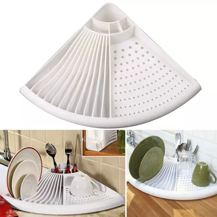 Description Ergonomic Design: over the sink SUS304 stainless still triangle design multipurpose dish drying rack for sink corner. Triangle design helps to make the best use of sink corner space Features This dish drainer can roll up and go in a drawer quickly when not in use.