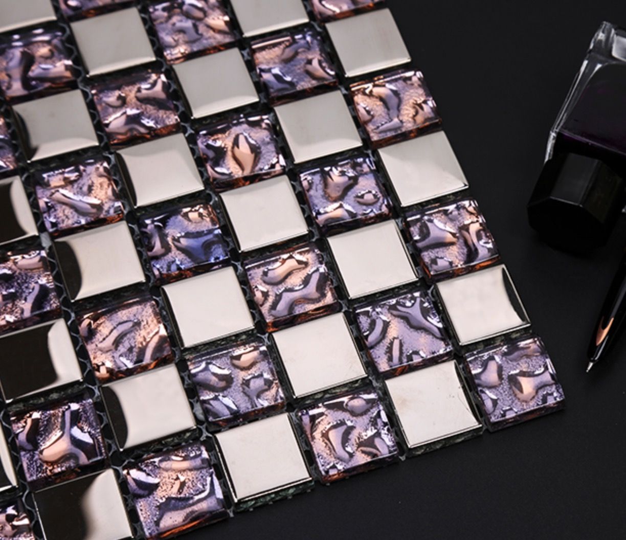 The main color of the glass tile is purple. There are some purple irregular pattern on the back of the chips. While producing this kind of tile, we used the special techniques that makes the tile looks like the "ice break". This is very special. The design style is unique and modern. It will become more and more popular for the colorful elements.