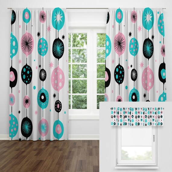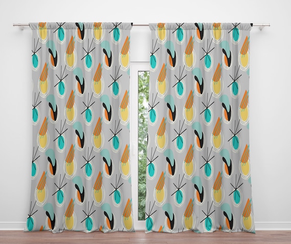 Mid Century Kitchen Curtains, Teal Mid Retro Grid Starbursts Orange Century Modern Retro 1950S 1960S MCM Window Curtain Panel, Retro Modern Window ...