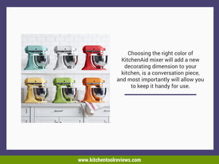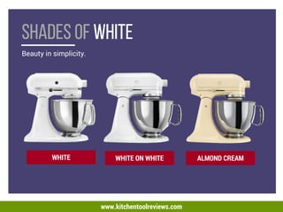 5 Best KitchenAid Mixers - Feb. 2022 - BestReviews Many KitchenAid mixers come in a variety of attractive, unique colors, with some models offering as many as 22 color options. We consider the color options available for each model we test. KitchenAid mixers are designed with various bowl sizes: capacities range from 3.5 to 7 quarts.
