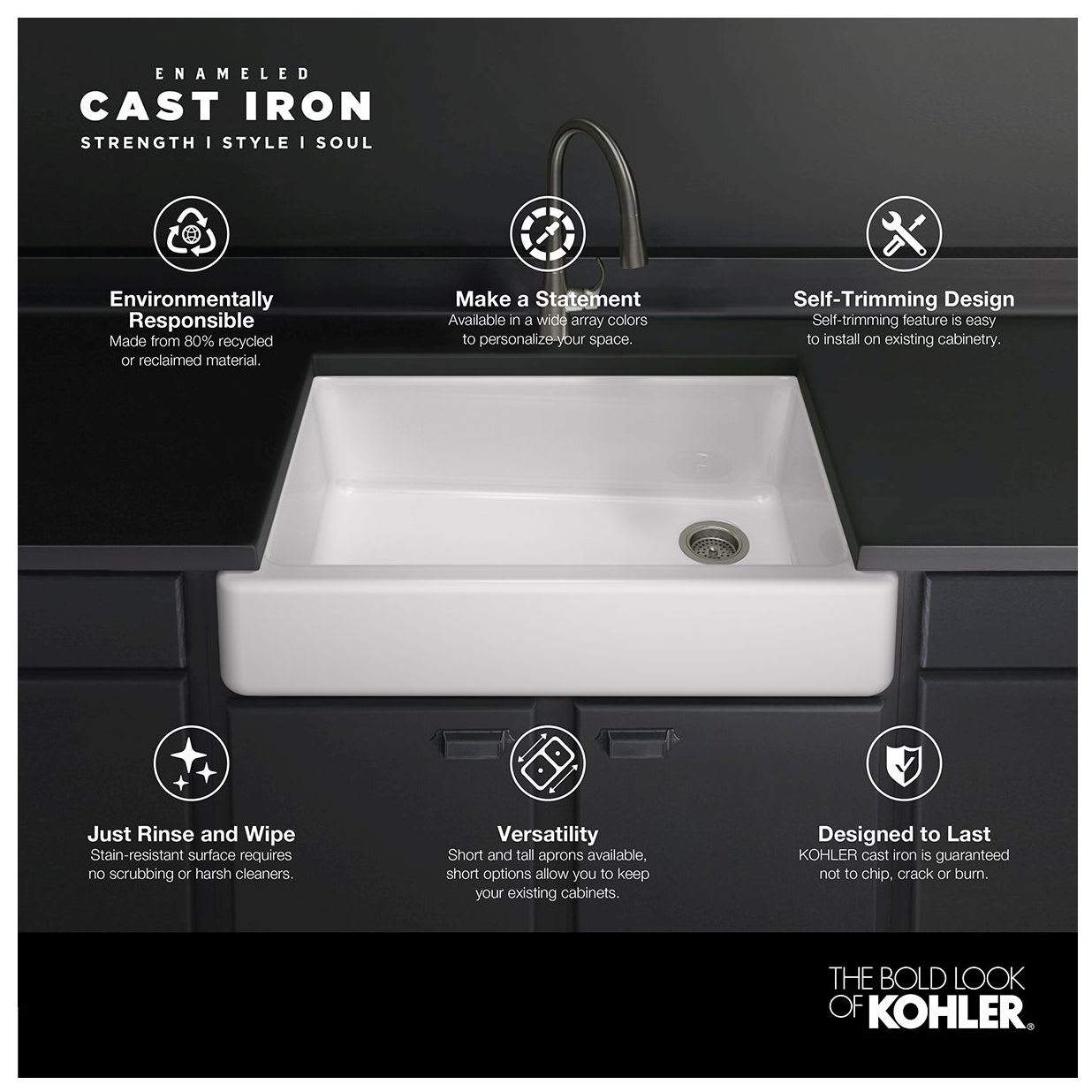 Kohler K-6489-47 Whitehaven 35-11/16" Farmhouse - Build.com Crafted from enameled cast iron, this sink resists chipping, cracking, or burning for years of beauty and reliable performance. A standard apron front makes it easy to install on 36-inch apron-front cabinetry. The Self-Trimming design requires only a simple rough cut, overlapping the cabinet face for beautiful results. Kohler K-6489 Features: