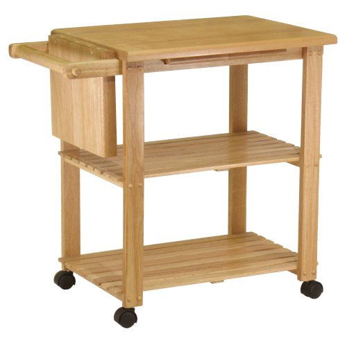 Winsome Beechwood Kitchen Cart with 2 Drop Leaves Details: Solid beechwood and plywood construction is durable and affordable Natural finish looks great with any decor Two drop-leaves increase to top counter 3 1/2 square ft. of counter top to 5 1/2 when you need it Top utility drawer plus lower shelf and storage cabinet 4 casters (2 locking) for easy mobility Some minor assembly required