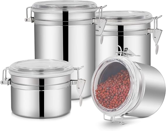 10 Best Airtight Containers For Flour And Sugar In 2022 - Aids Quilt Perfect for Different Storage—-Our kitchen storage containers set comes in two different sizes. 2 large containers are 3.3 quart (3.6 liters), which is the ideal size for a 5 lb bag of flour and sugar. Other 4 medium containers are 1.5 quart (1.6 liters ), they are perfect for storing a small box of cereal (300g). {Updated} Top 10 Best canisters for flour and sugar {Guide & Reviews} Canister Sets for Kitchen Counter, ENLOY 4-Piece Stainless Steel Airtight Food Storage Canister Set with Clear Lid for Sugar, Flour, Tea, Candy, Cookie, Spice and More, 28/32/38/65 oz Airtight Design --- The rubber seal will stay on in place and perfectly connected to the edge of the canister.
