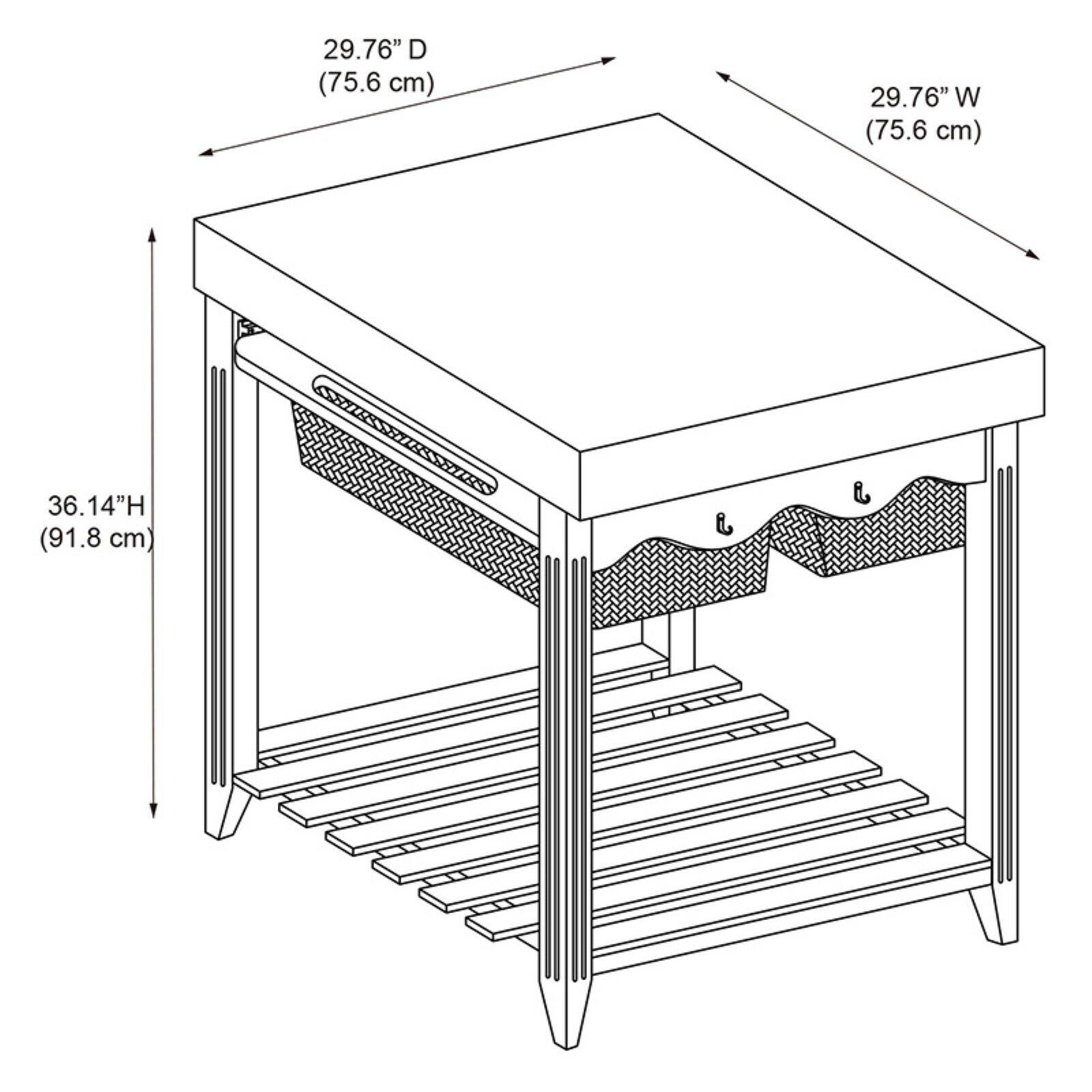 Linon Kolton Wood Butcher Block Kitchen Island in Black A square kitchen island that is your kitchen storage and food preparation center essential for gourmet food preparation with butcher block top, 2 basket pull out drawers, slat easy access storage base shelf, 4 utensil hooks, and adjustable glides. Includes accessory kit containing spoon, spatula and tongs. Finished in Black. Some assembly required.