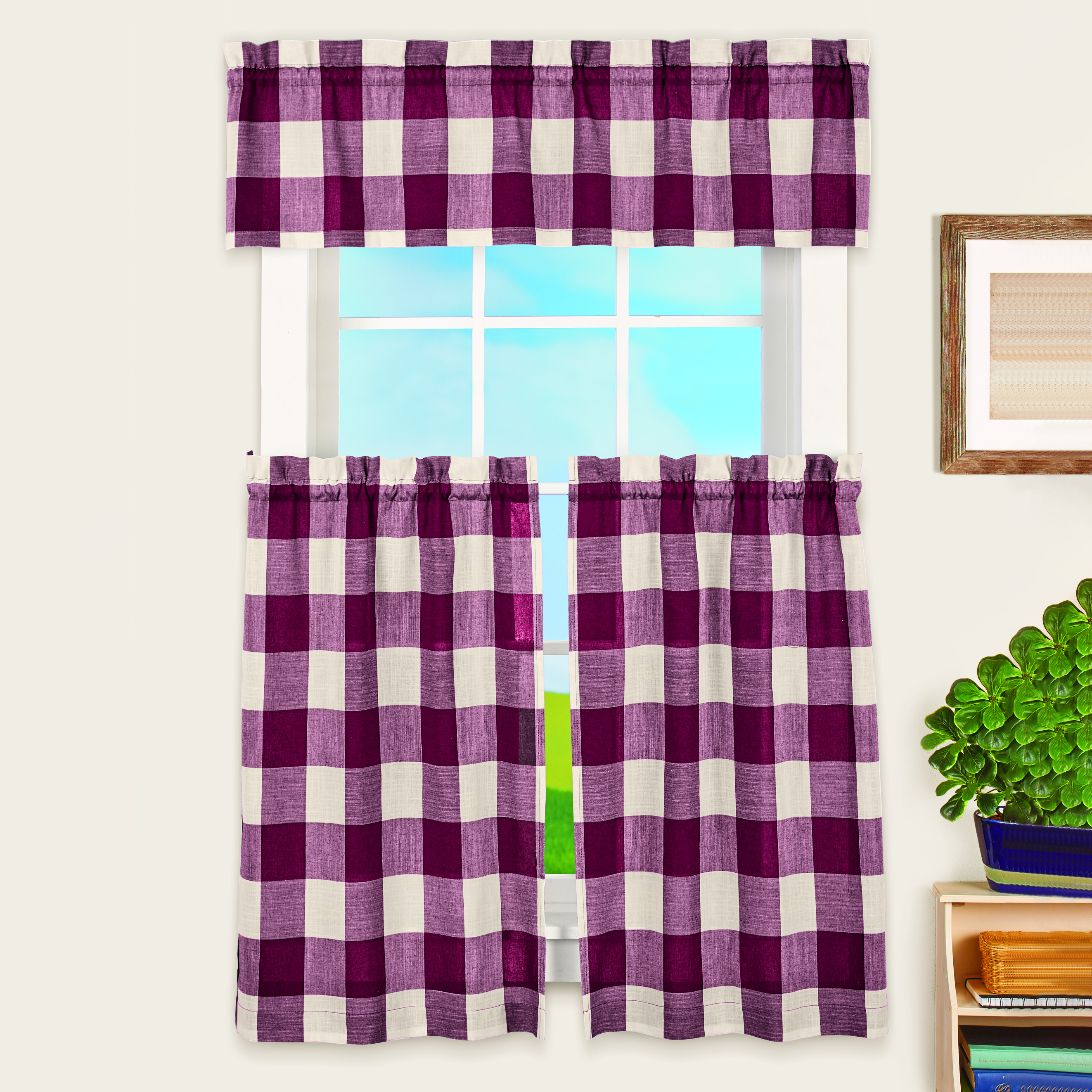 Better Homes & Gardens Checks N Solids Gingham Check Light Filtering Rod Pocket Kitchen Curtain Tier and Valance Set, 3 Piece, Red, 60" x 36"