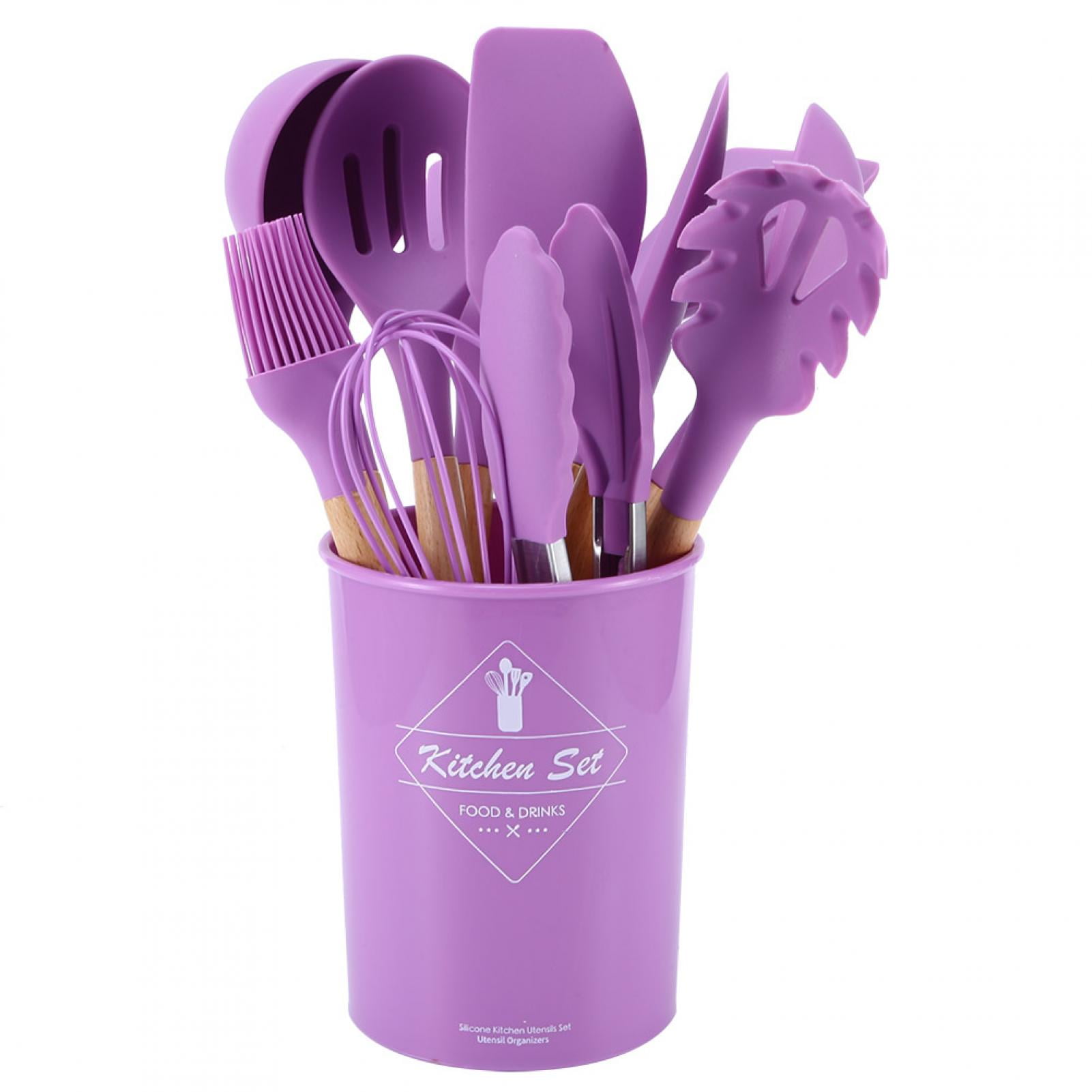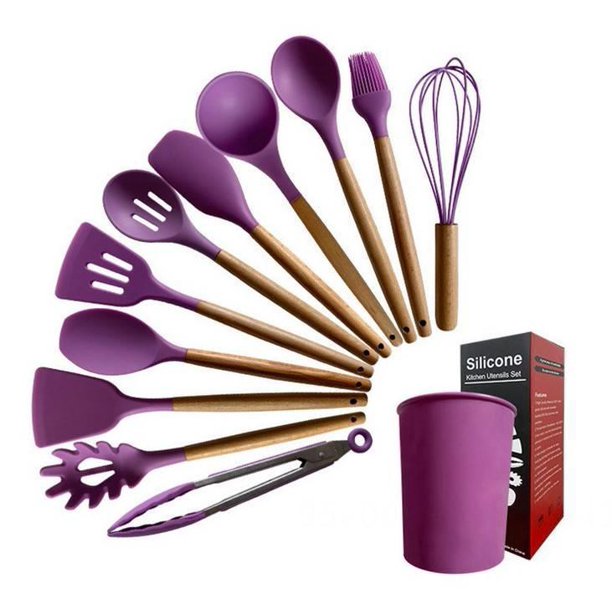 12pcs Purple Silicone Cooking Kitchen Utensil Set - amazon.com Item: 14pcs Utensil sets. Color:Purple Item Include: 11pcs kitchen gadgets,1storage bucket, 2 rotatable hooks. Material: Wooden handle ,silicone material. BPA free: Easy to clean, sturdy and heat resistant. Would be a great gift for Mother's Day, Father's Day, housewarming, thanksgiving and christmas, and get this set for camping is perfect.